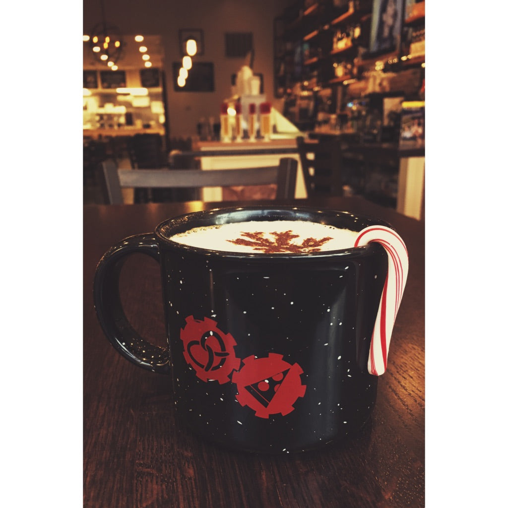 a cheerfully branded Pretzel and Pizza Creations ceramic mug